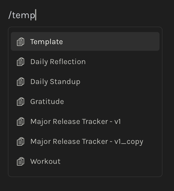 folder in your workspace. Each template is a standard markdown file containing the content structure you want to reuse. When applied, the template's content is inserted at your cursor position, not as a new note.